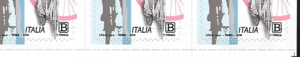 Fausto Coppi Sorten - Rechter Block mit Barcode - Radsport MNH - Block von sechs Exemplaren linke untere Blattecke mit Barcode - Drei Exemplare weisen Schleppstruktur zwischen ITALIEN und B auf - Gelegentliche Sorte Cod. 33/WEB