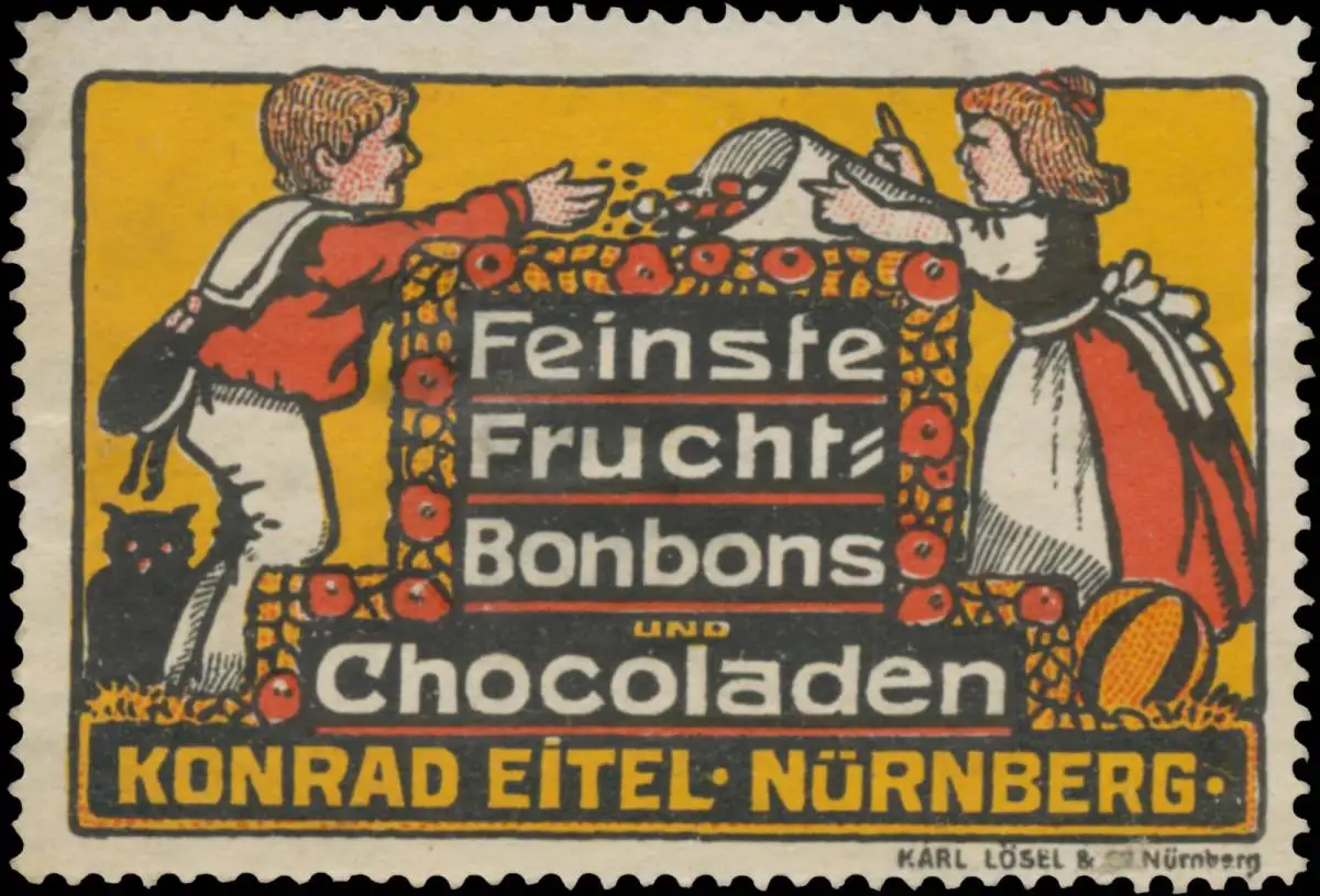 Schokolade, Druck: Karl Lösel & Co., Nürnberg, Größe/Zustand: 4x6 , guter Zustand, Original alte Reklamemarke die seinerzeit für die Werbung benutzt wurde