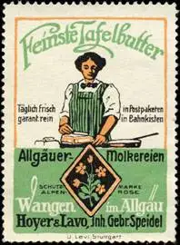 garantiert rein, in Postpaketen, in Bahnkisten. Allgäuer Molkereien Hoyer & Lavo, Inhaber : Gebrüder Speidel, Wangen im Allgäu, Butter, Größe/Zustand: 6x4 , guter Zustand, Original alte Reklamemarke die seinerzeit für die Werbung benutzt wurde