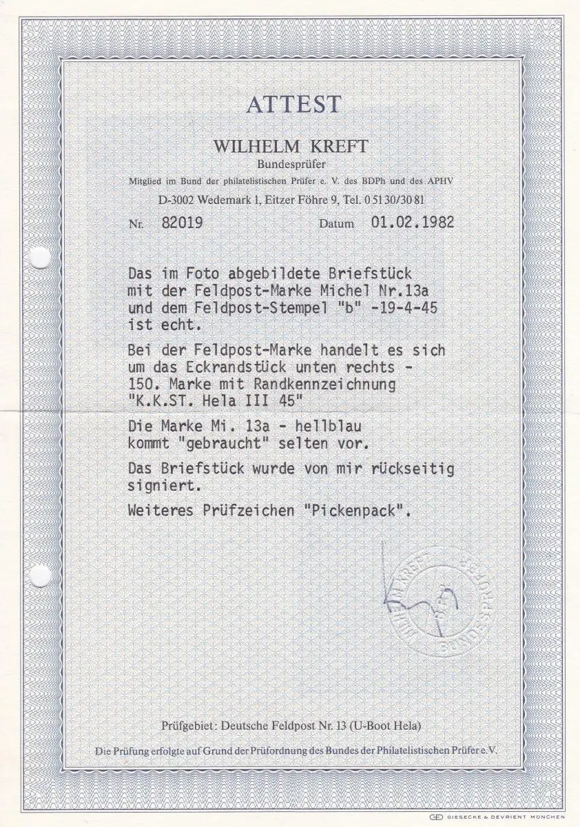 Feldpost: MiNr. 13 a, gestempelt, Eckrandstück, BPP Attest