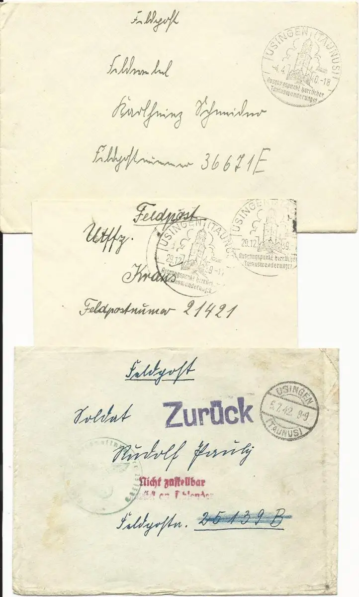 Feldpost WK II 1939/42, 3 Brief v. Usingen, 1mal "Zurück", "Nicht zustellbar.."