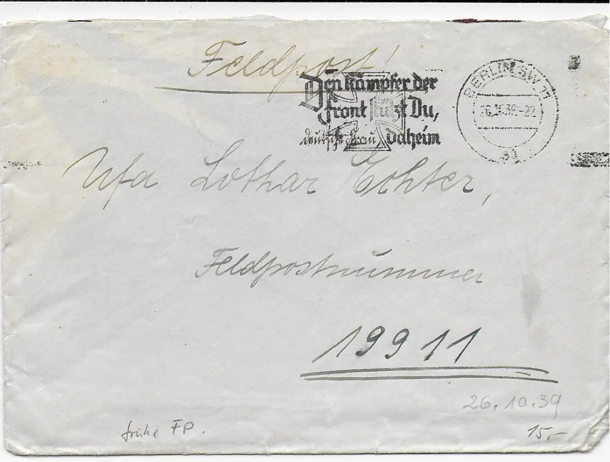 Feldpost: frühe Feldpost 26.10.1939 Berlin an FPNr. 19911