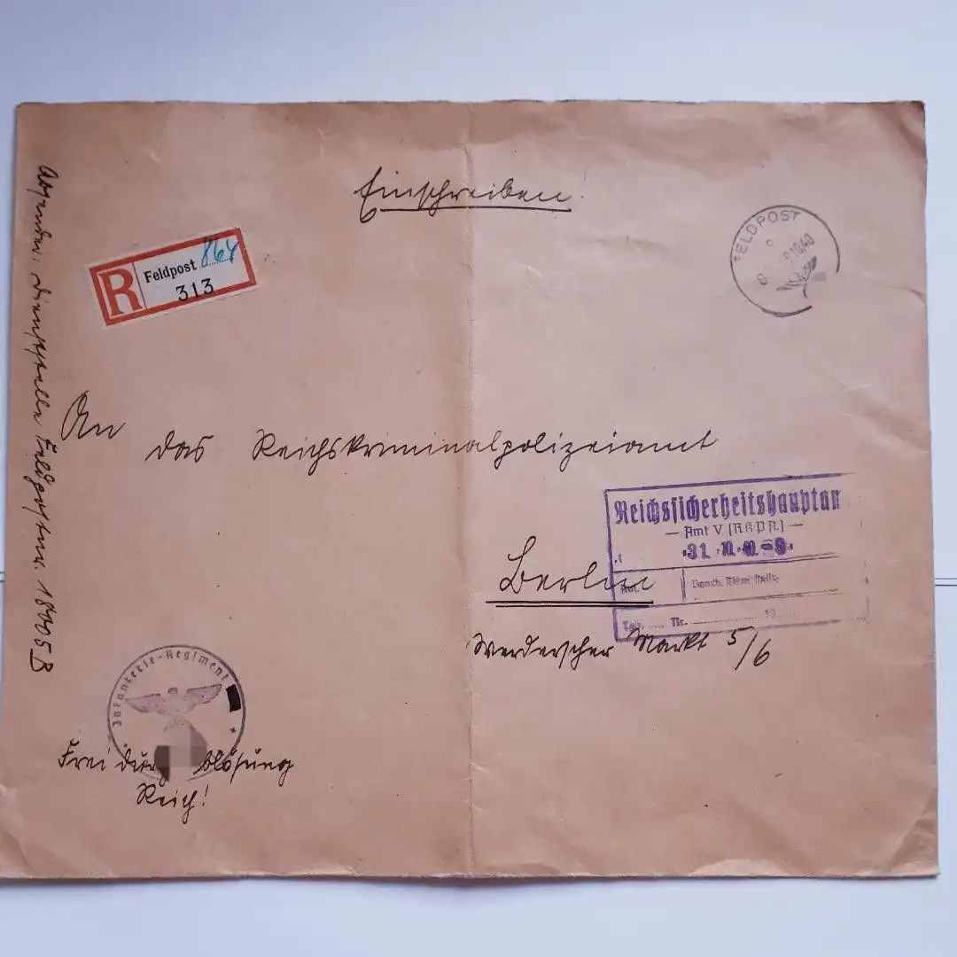 Feldpostbrief Einschreiben an das RSHA Amt V Kriminalpolizei 1940