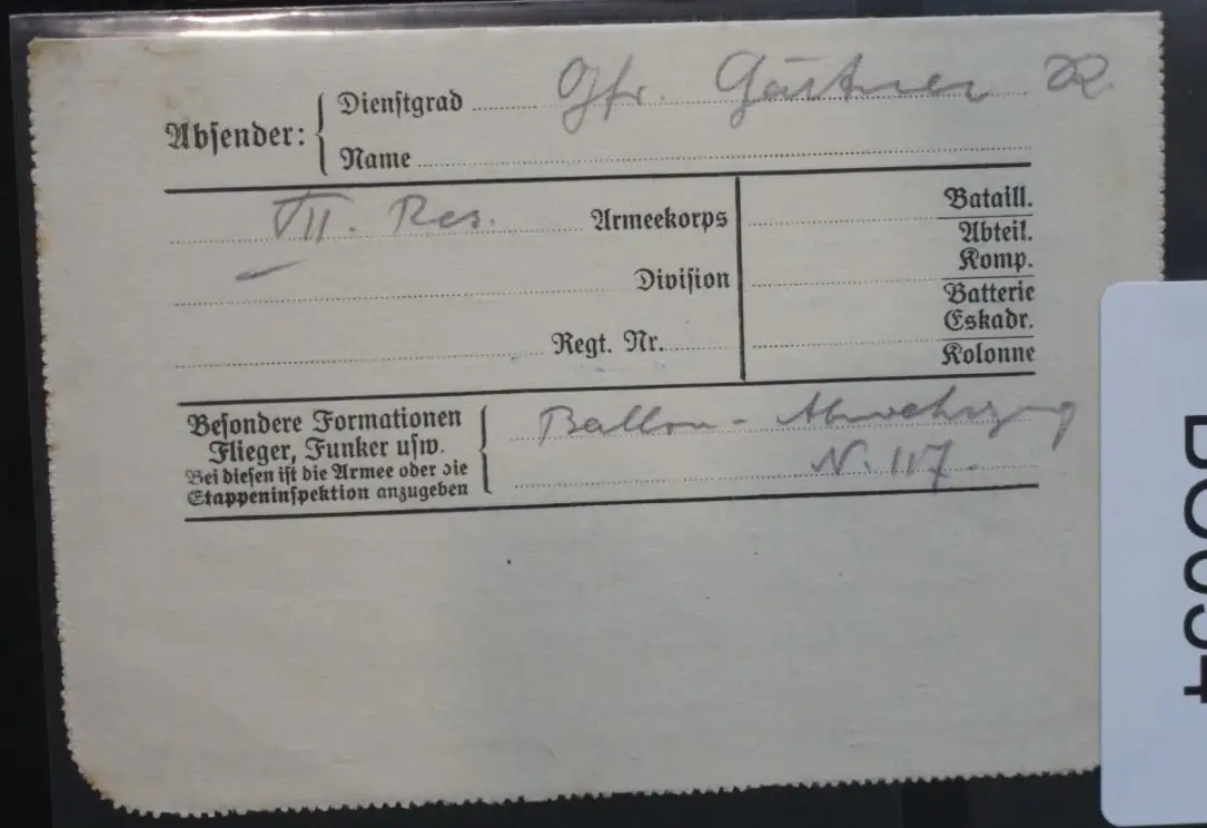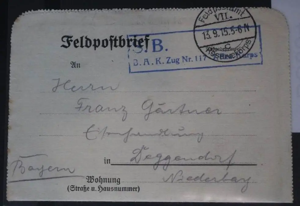 Feldpostbrief Stempel „S.B. B.A.K. Zug Nr. 117 - 7.Res.Korps" #BC054