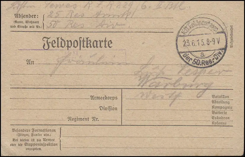 Feldpostkarte K.D. Feldpostexp. 50. Reserve-Division 23.6.15 nach Warburg