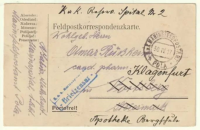 Bemerkungen: Gelaufen mit Stempel: Zweizeiler blau neben K. u. K. MFPA/30.IV.16 a Pola.