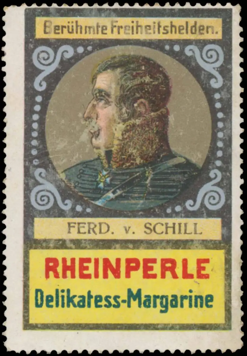Serie: Berühmte Freiheitshelden, Rheinperle Delikatess-Margarine, Größe/Zustand: 6x4 , Fehldruck, guter Zustand, Original alte Reklamemarke die seinerzeit für die Werbung benutzt wurde