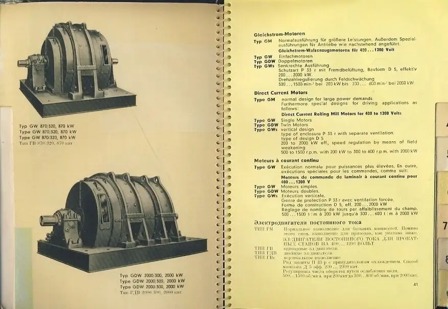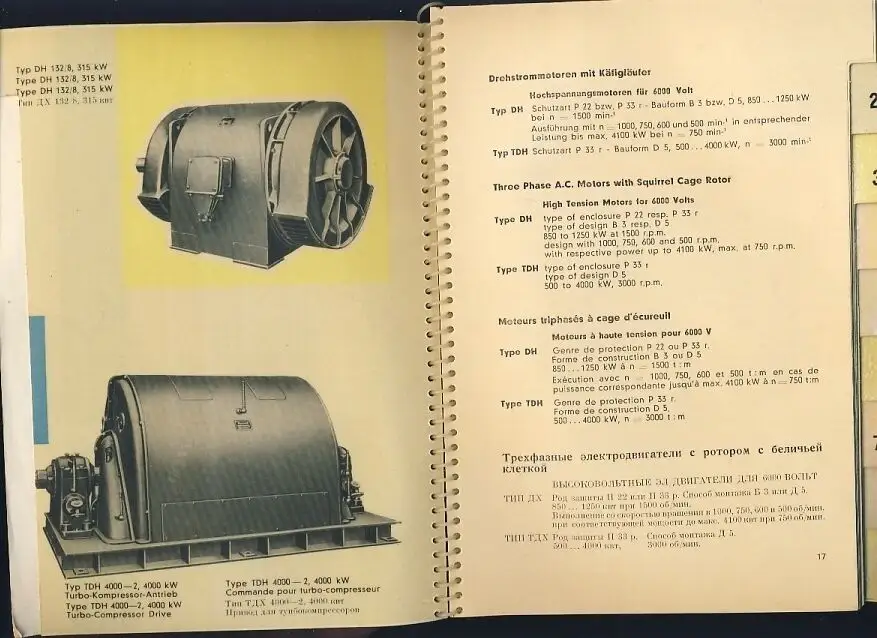 sehr guter Zustand, geringe Gebrauchs- und Alterungsspuren: Einband teils leicht verschmutzt - Seiten sauber und ordentlich, Katalog-Nummer: F8defr in deutscher + englischer + französischer + russischer Sprache - Drehstrom-Asynchron-Motoren - Drehstrom-Synchron-Motoren - Gleichstrom-Motoren - Aggregate und Spezialantriebe - Drehstrom-Synchron-Generatoren und Phasenschieber - Mittelfrequenz-Umformer - Hochspannungs-Schaltgeräte - Hochspannungs-Schaltanlagen - Güter des Bevölkerungsbedarfs - Rundfunkgeräte (Radios) - Nähmaschinen-Motoren - Lufterhitzer, kartoniert, ca. 15 x 20,5, Ringbuchbinder mit ca. 110 Seiten und zahlreichen Bildern