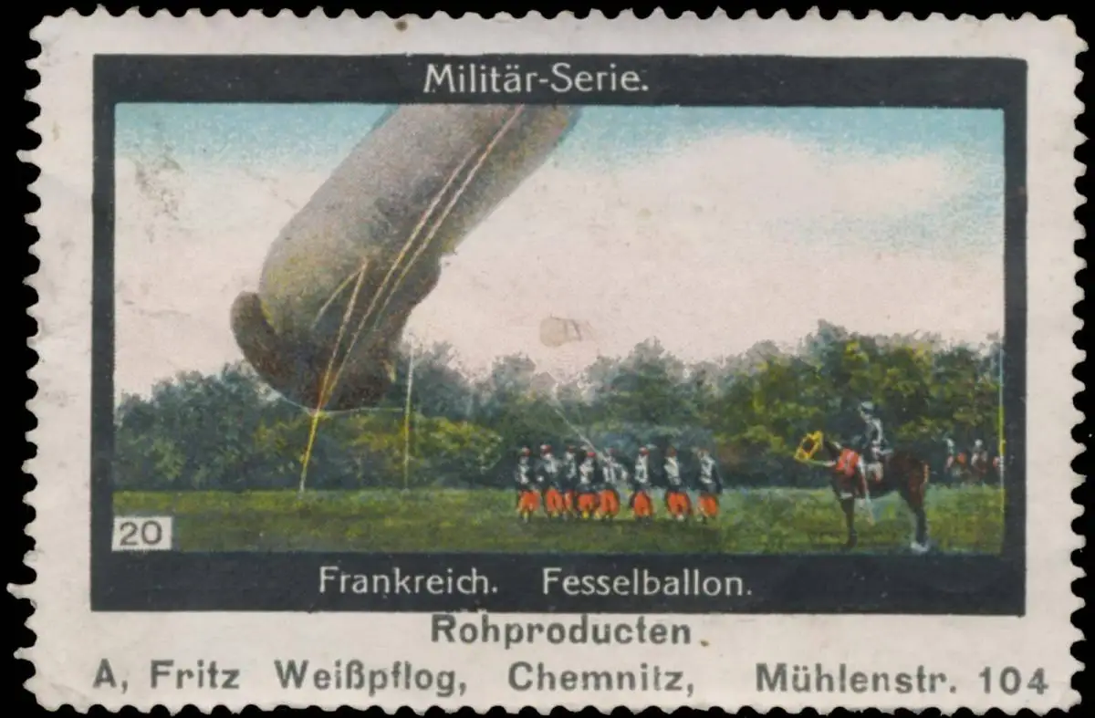 Flugmarke, Ballon, Militär-Serie, Rohproducten, Mühlenstraße 104, Größe/Zustand: 5x7 , leicht fleckig, Original alte Reklamemarke die seinerzeit für die Werbung benutzt wurde