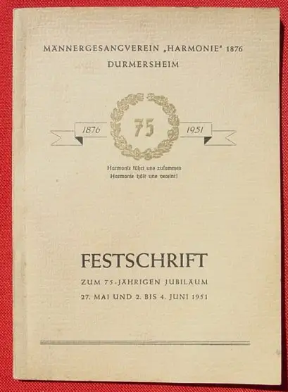 "Festschrift des Maennergesangsverein 'Harmonie' 1876 in Durmersheim zum 75-jaehrigen Jubilaeum 1951". 80 Seiten. Mit Foto-Abbildungen
