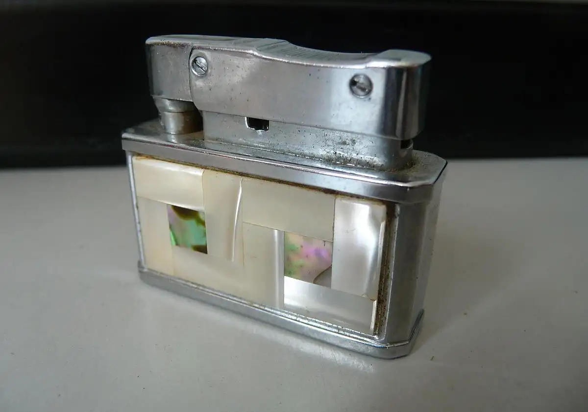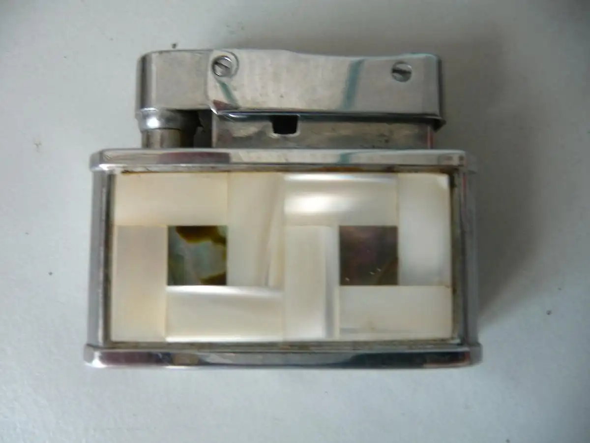 Kleines Benzin-Feuerzeug aus Stahl Vorderseite mit Perlmutt-Einlegearbeit, Rückseite mit abgekratzter Werbe-Aufschrift Boden mit Prägung "Pinnacle Superior Quality Lighter" Maße ca. 42 x 34 x 17 mm Mit kleinen Alters- und Gebrauchsspuren
