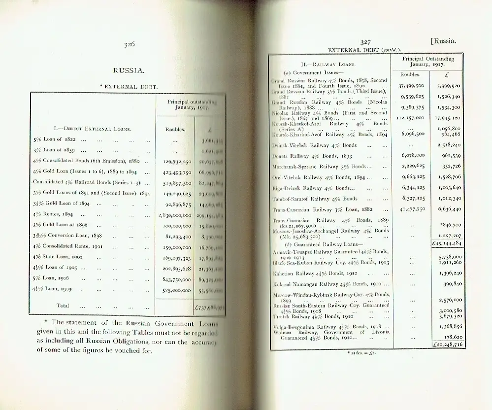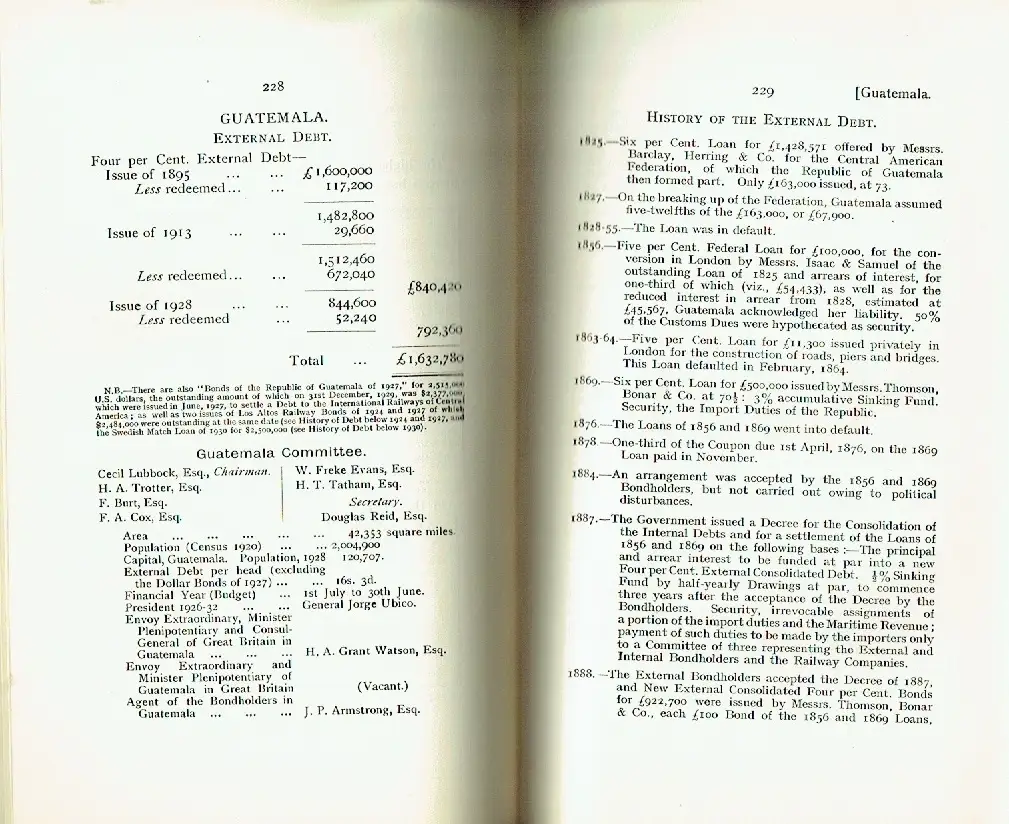 guter Zustand, geringe Gebrauchs- und Alterungsspuren: wurde in einer Klemmmappe aufbewahrt, dadurch vorn und hinten eine Druckkante senkrecht entlang des Rückenfalzes, Rückseite und die hinteren Seiten rechts oben auch etwas knittrig/wellig - Umschlag und Seiten teils etwas eselsohrig - Seiten sauber und ordentlich, selten gering stockfleckig - senkrechter Seitenschnitt mit einem Kratzer quer rüber, Origin, Functions and Procedure of the Corporation and List of Present and Past Members of the Council - General Report - Argentina - Province of Buenos Aires - Austria-Hungary - Bulgaria - Colombia - Costa Rica - Ecuador - Egypt - Greece - Guatemala - Honduras - Liberia - Mexico - Nicaragua - Paraguay - Portugal - Russia - Salvador - Santo Domingo - Spain - Turkey - United States of Amerika - Uruguay - Venezuela - Principal Loans in default - Balance Sheet - Appendix, kartoniert, ca. 14 x 21,5, 431 Seiten