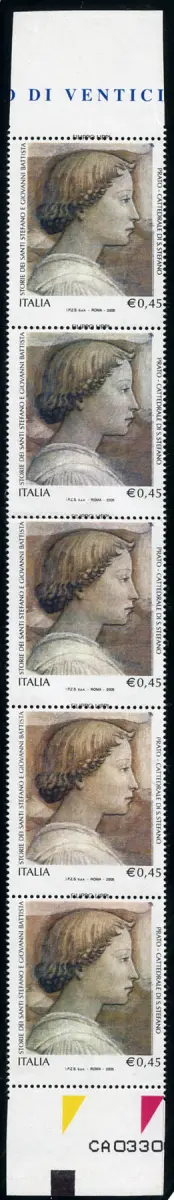 Filippo Lippi Sorte verschobene Verzahnung Vollgummi - Filippo Lippi 0,45 Nr. 2850 vertikaler Streifen von fünf Exemplaren mit stark verschobenen horizontalen Verzahnung und mit erheblichen Tintenfehlern beim Druck, so dass die beiden oberen Briefmarken dunkler als normal sind, während das letzte Exemplar unten grünlich ist - Edles Set - alle Briefmarken sind Carraro signiert - Foto ist Richtwert Code 629/7