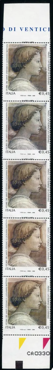 Filippo Lippi Sorte verschobene Verzahnung Vollgummi - Filippo Lippi 0,45 Nr. 2850 vertikaler Streifen von fünf Exemplaren mit stark verschobenen horizontalen Verzahnung und mit erheblichen Tintenfehlern beim Druck, so dass die beiden oberen Briefmarken dunkler als normal sind, während das letzte Exemplar unten grünlich ist - Edles Set - alle Briefmarken sind Carraro signiert - Foto ist Richtwert Code 629/7