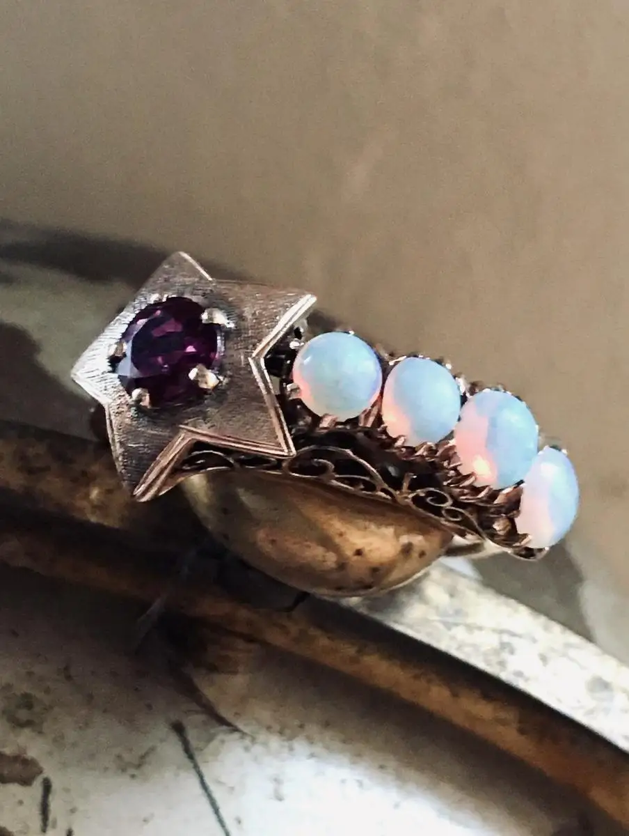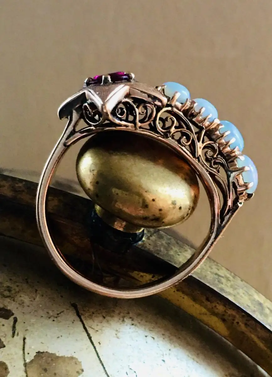 Ring STERNSCHNUPPE, Sonderanfertigung, antik, 500 Gold, Rubin, 4 Opale