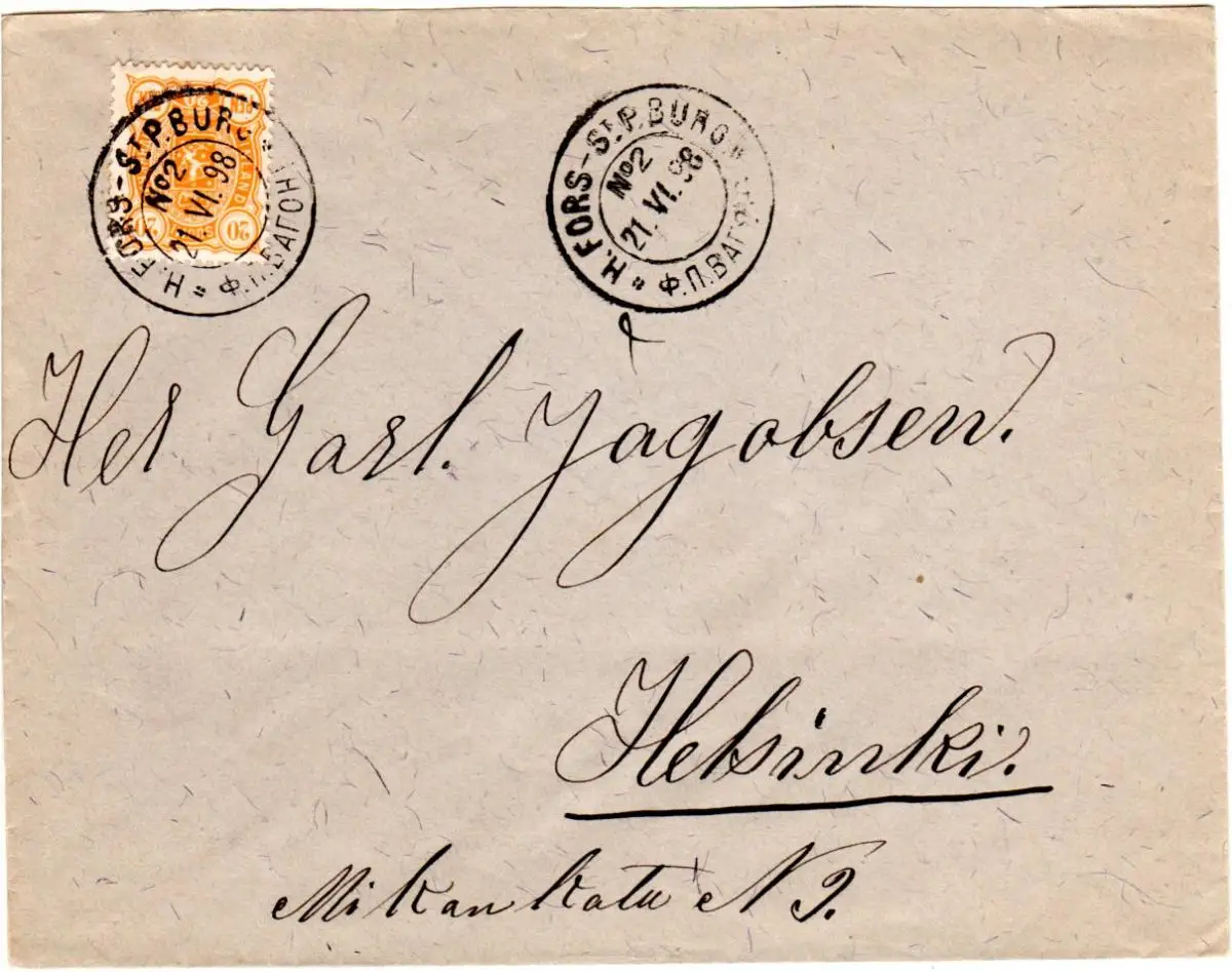 Finnland 1898, H.FORS-St.P.BURG No.2, Bahnpost-K2 klar auf Brief m. 20 Penni