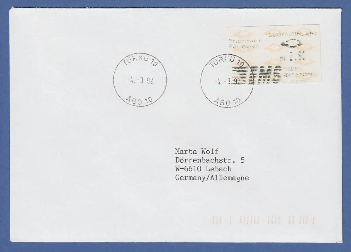 Finnland 1992 Dassault-ATM 2.Ausgabe Turku EMS Mi-Nr 12.2 Z6 2,90 auf Ausl.-Bf.