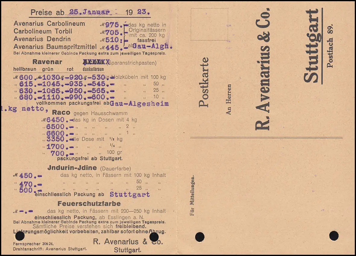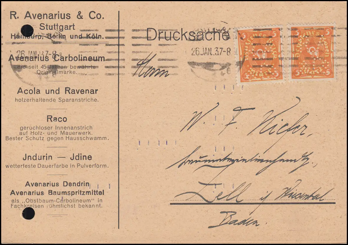 portogerechte Mehrfachfrankatur auf Drucksache (Doppel-Postkarte) der Firma R. Avenarius & Co Holzanstiche / Innenfarben / Feuerschutzfarben in Stuttgart nach Zell / Baden, Kate mit Aktenlochung