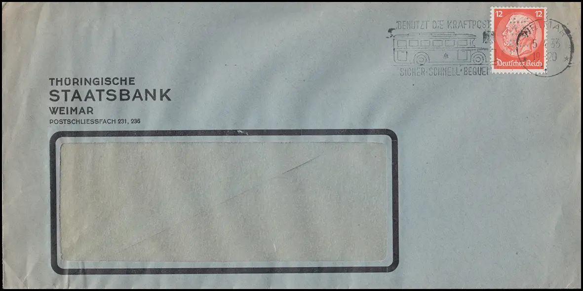 portogerechte Einzelfrankatur auf Brief im Fernverkehr (Fensterbrief-Umschlag) der Thüringischen Staatsbank in Weimar mit Werbestempel "BENUTZT DIE KRAFTPOST - SICHER SCHNELL BEQUEM!