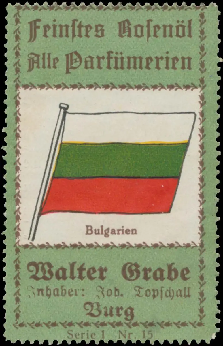 Feinstes Rosenöl, alle Parfümerien, Drogerie Walter Grabe, Inhaber: Joh. Topschall, Serie, 1, Nr. 15, Größe/Zustand: 7x4 , guter Zustand, Original alte Reklamemarke die seinerzeit für die Werbung benutzt wurde