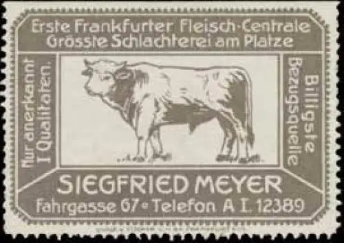 Erste Frankfurter Fleisch-Centrale, geösste Schlachterei am Platze, Fleischerei, Rind, Größe/Zustand: 4x6 , guter Zustand, Original alte Reklamemarke die seinerzeit für die Werbung benutzt wurde