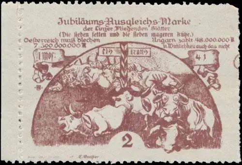 Jubiläums-Ausgleichs-Marke der Linzer fliegenden Blätter, die sieben fetten und die sieben mageren Kühe, Österreich muß 7.500 000 000 blechen, Ungarn 48.000 000 zahlt in Wirklichkeit auch das nicht., Größe/Zustand: 4x5 , guter Zustand, Original alte Reklamemarke die seinerzeit für die Werbung benutzt wurde