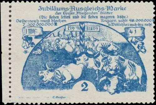 Jubiläums-Ausgleichs-Marke der Linzer fliegenden Blätter, die sieben fetten und die sieben mageren Kühe, Österreich muß 7.500 000 000 blechen, Ungarn 48.000 000 zahlt in Wirklichkeit auch das nicht., Größe/Zustand: 4x5 , guter Zustand, Original alte Reklamemarke die seinerzeit für die Werbung benutzt wurde