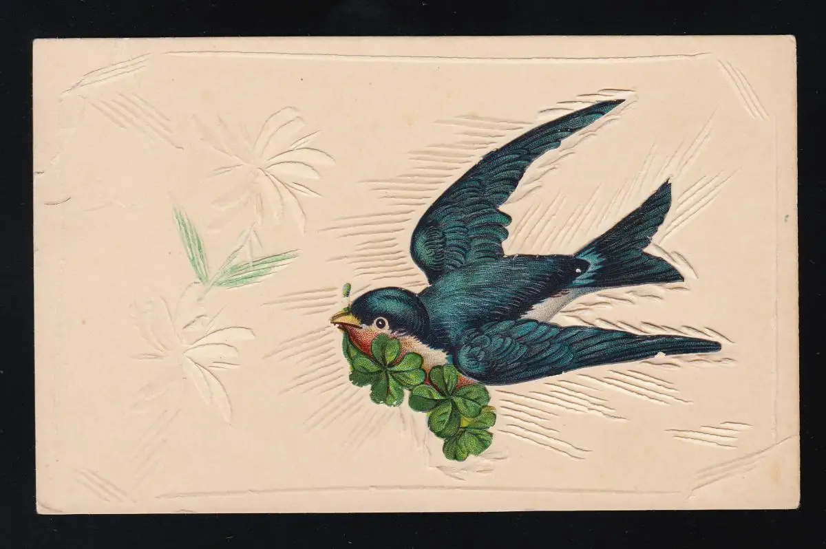 Fliegende Schwalbe Glücksklee im Schnabel, Ornamente Blüten Wind, ungebraucht