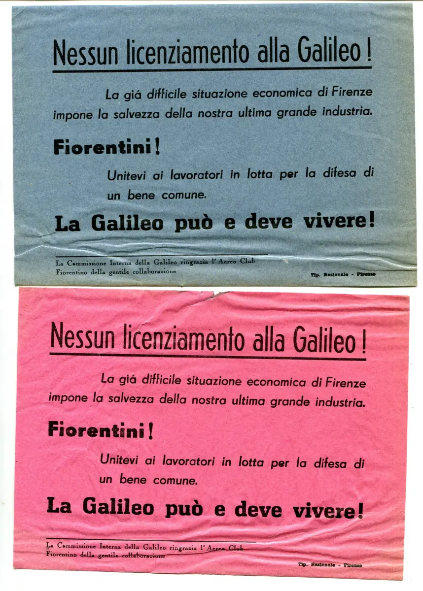 Florenz Keine Entlassung bei Galileo - Zwei Flyer (verschiedene Farben), die vom Aereo Club auf Florenz zur Verteidigung der Galileo-Arbeiter während der harten Zusammenstöße mit den Polizeikräften im Januar 1959 gestartet wurden - sehr guter Zustand Nr. 607/A