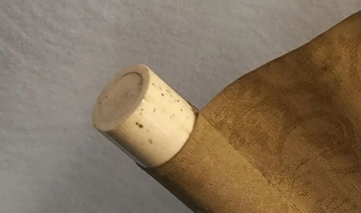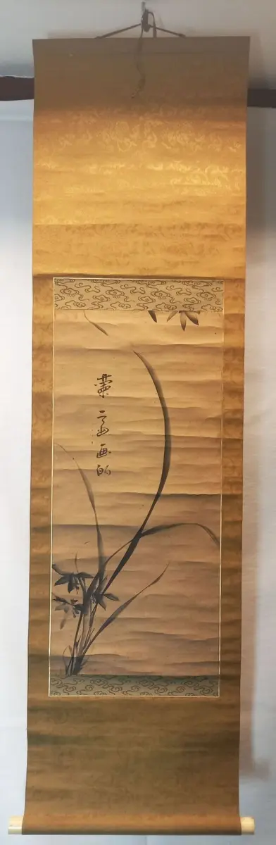Japan. Antique hanging paper scroll. Bordered with silk brocade. Heigth 46". Width 12,5" (ca. 117 x 32 cm). Bone roller ends. Few minor damages on the edges and on the roller.