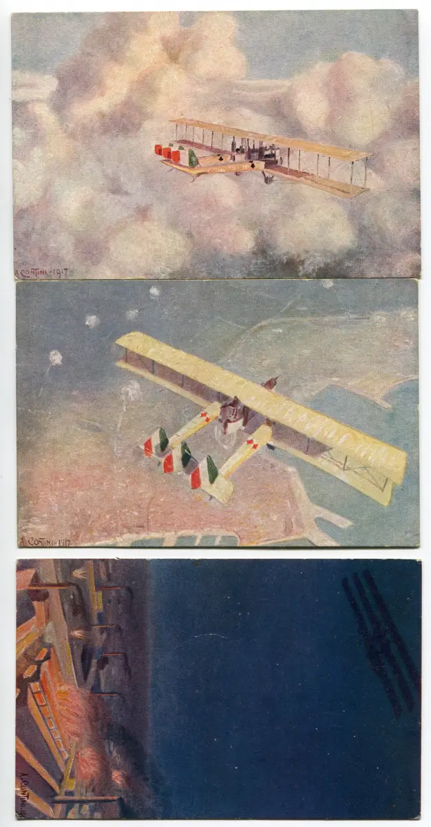 Flugdrucke - 3 gezeichnete Postkarten Amerigo Contini Postkarte - Flugdrucke - Lot von drei verschiedenen Postkarten, die vom BIP gezeichnet wurden. Zehn. Amerigo Contini; Bombardierung eines Industriezentrums, Caproni-Flugzeug auf Triest und Caproni-Flugzeug, das auf den Wolken segelt - nicht gereist - Schönes Set Cod. 68/15
