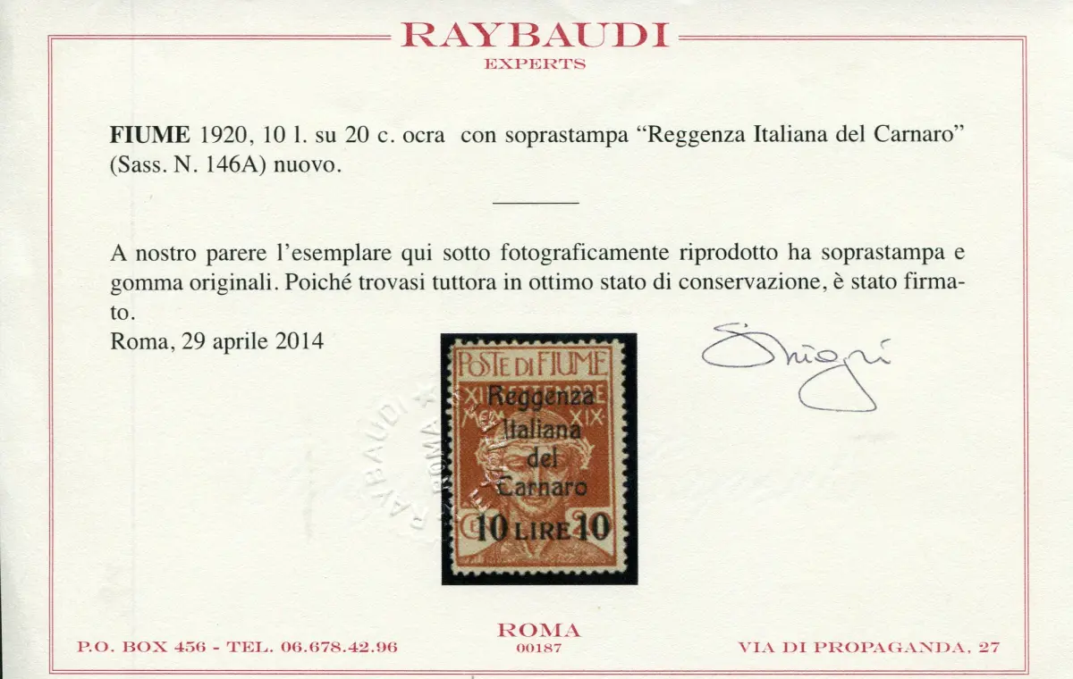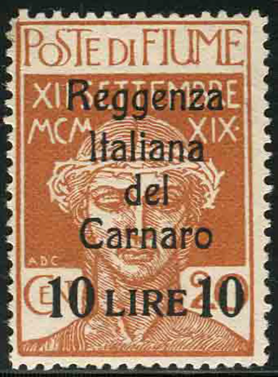 Fluss - Regenza del Carnaro Lire 10 auf Cent. 20 - sehr gute Spur von Linguella MH - Fluss - Regenza del Carnaro Lire 10 auf Cent. 20 n. 146A - sehr gut, gute Zentrierung - Cert. Ray. - Kat. euro 2.500 n. 910/6