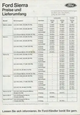 Ford Sierra Preisliste 4.1985
