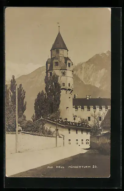 Foto-AK A. Stockhammer: Hall, Münzerturm und Bergpanorama
