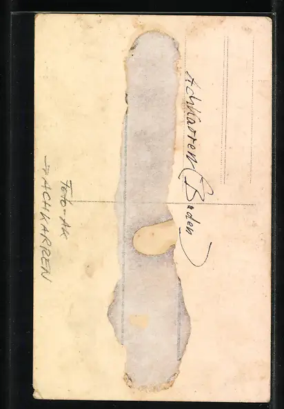 Personenbezogene Daten auf der Rückseite der Karte wurden durch blauen Textmarker unkenntlich gemacht. Die blauen Stellen sind auf die Vorderseite durchgeweicht und wirken sich negativ auf das Postkartenfoto aus