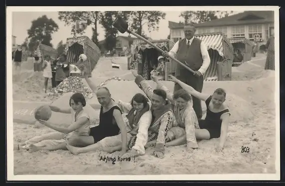 Foto-AK Achtung Kurve!, Gruppe in Bademode vor Strandkörben, 1930