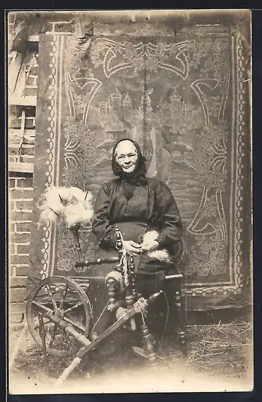 Foto-AK Alte Frau am Spinnrad