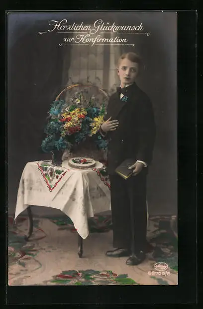 Foto-AK Amag: Junge mit einem Korb voller Blumen, Konfirmation