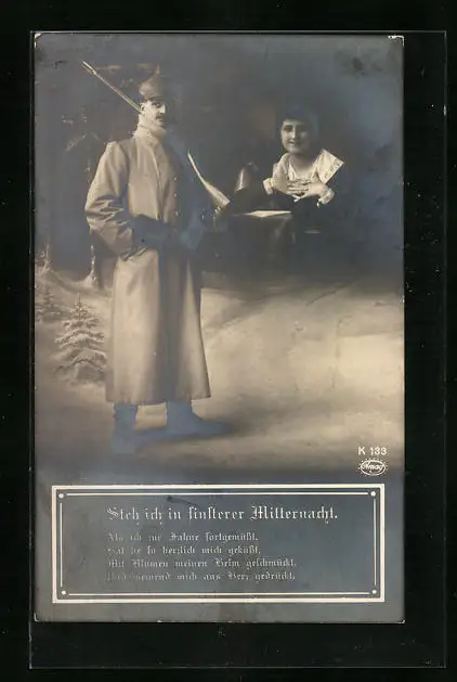 Foto-AK Amag: Soldat in Uniform mit Gewehr gedenkt seiner Frau