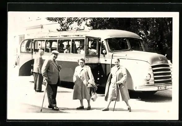 Foto-AK Ausflugsteilnehmer neben ihrem Autobus