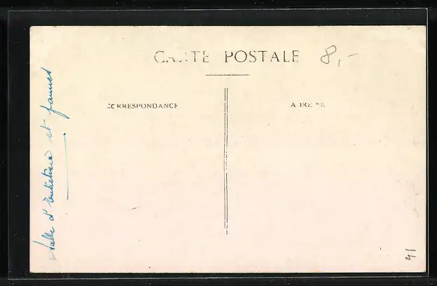 Personenbezogene Daten auf der Rückseite der Karte wurden durch blauen Textmarker unkenntlich gemacht. Die blauen Stellen sind auf die Vorderseite durchgeweicht und wirken sich negativ auf das Postkartenfoto aus