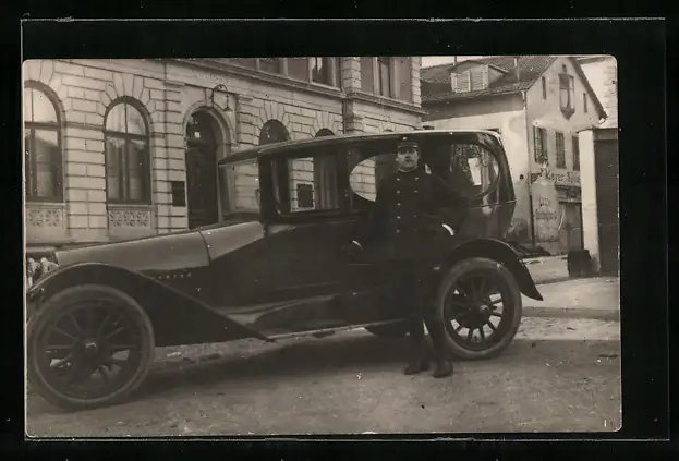Foto-AK Auto, Chauffeur in Uniform an seinem KFZ