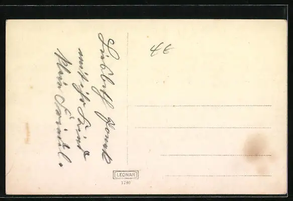 Personenbezogene Daten auf der Rückseite der Karte wurden durch blauen Textmarker unkenntlich gemacht. Die blauen Stellen sind auf die Vorderseite durchgeweicht und wirken sich negativ auf das Postkartenfoto aus