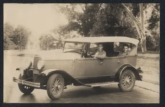 Foto-AK Auto mit Kennzeichen 1828, darin zwei Männer