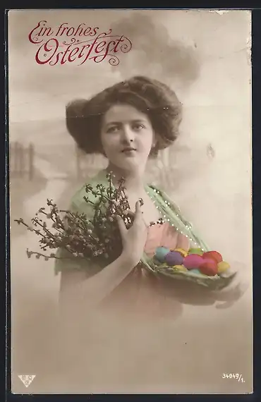 Foto-AK BNK Nr. 34049 /1: Frau mit Osterkorb und Weidenzweig, Ostergruss