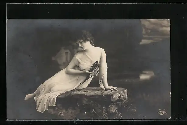 Foto-AK BNK Nr. 34769 /1: Frau sitzt auf Felsen am Bach