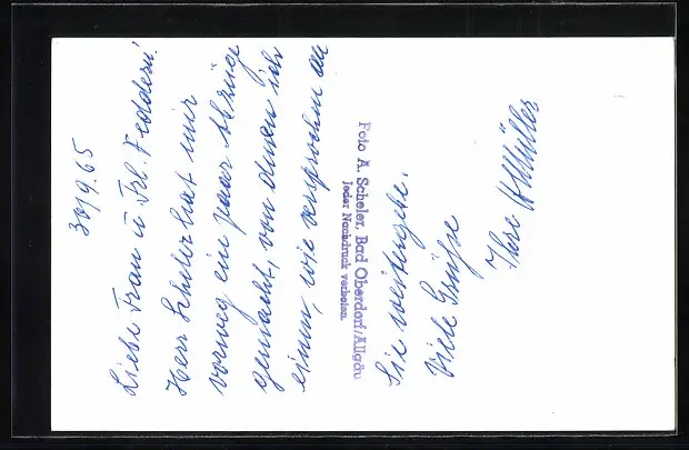 Personenbezogene Daten auf der Rückseite der Karte wurden durch blauen Textmarker unkenntlich gemacht. Die blauen Stellen sind auf die Vorderseite durchgeweicht und wirken sich negativ auf das Postkartenfoto aus