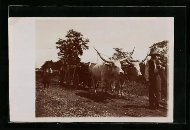Foto-AK Bauern mit Kuh-Gespann auf einer Landstrasse