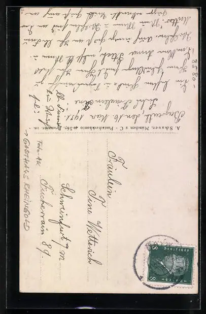 Personenbezogene Daten auf der Rückseite der Karte wurden durch blauen Textmarker unkenntlich gemacht. Die blauen Stellen sind auf die Vorderseite durchgeweicht und wirken sich negativ auf das Postkartenfoto aus