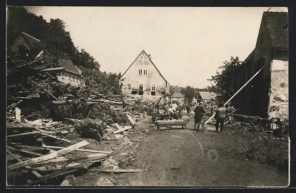 Foto-AK Berggiesshübel, Nach Unwetter zerstörte Ortspartie